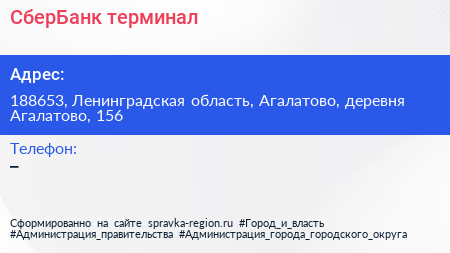 СберБанк, терминал по адресу 188653, Ленинградская область, Агалатово, деревня Агалатово, 156 в дальнейшем Организация, размещена в следующих категориях: