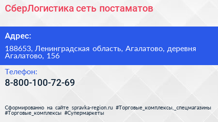 СберЛогистика, сеть постаматов по адресу 188653, Ленинградская область, Агалатово, деревня Агалатово, 156 в дальнейшем Организация, размещена в следующих категориях: