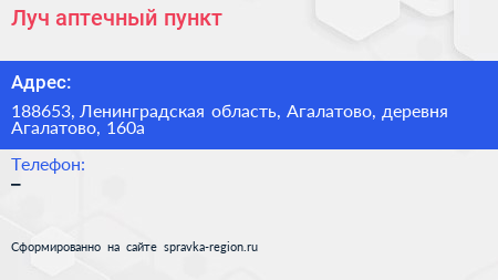 Луч, аптечный пункт по адресу 188653, Ленинградская область, Агалатово, деревня Агалатово, 160а в дальнейшем Организация, размещена в следующих категориях:
