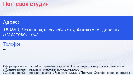 Ногтевая студия по адресу 188653, Ленинградская область, Агалатово, деревня Агалатово, 160а в дальнейшем Организация, размещена в следующих категориях: