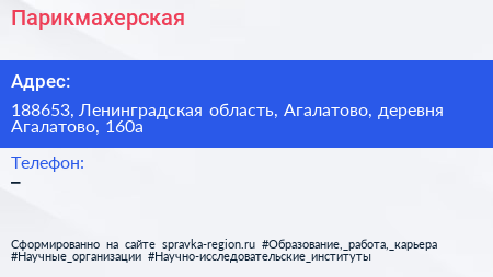 Парикмахерская по адресу 188653, Ленинградская область, Агалатово, деревня Агалатово, 160а в дальнейшем Организация, размещена в следующих категориях: