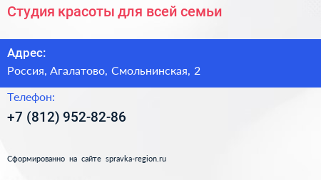 Студия красоты для всей семьи по адресу 2, Смольнинская улица, ЖК «Шуваловский парк», Вартемяги, Агалатовское сельское поселение, Всеволожский район, Ленинградская область, Северо-Западный федеральный округ, 188653, Россия в дальнейшем Организация, размещена в следующих категориях: