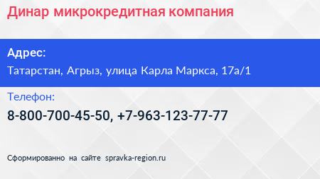 Динар, микрокредитная компания по адресу Татарстан, Агрыз, улица Карла Маркса, 17а/1 в дальнейшем Организация, размещена в следующих категориях: