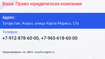 Ваше Право, юридическая компания по адресу Татарстан, Агрыз, улица Карла Маркса, 17а в дальнейшем Организация, размещена в следующих категориях: