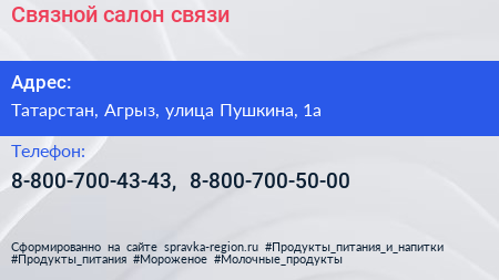 Связной, салон связи по адресу Татарстан, Агрыз, улица Пушкина, 1а в дальнейшем Организация, размещена в следующих категориях: