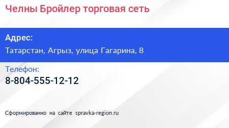 Челны-Бройлер, торговая сеть по адресу Татарстан, Агрыз, улица Гагарина, 8 в дальнейшем Организация, размещена в следующих категориях: