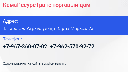 КамаРесурсТранс, торговый дом по адресу Татарстан, Агрыз, улица Карла Маркса, 2а в дальнейшем Организация, размещена в следующих категориях: