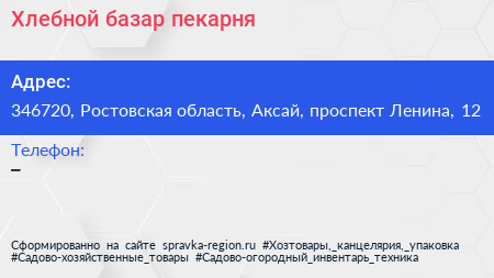 Хлебной базар, пекарня по адресу 346720, Ростовская область, Аксай, проспект Ленина, 12 в дальнейшем Организация, размещена в следующих категориях: