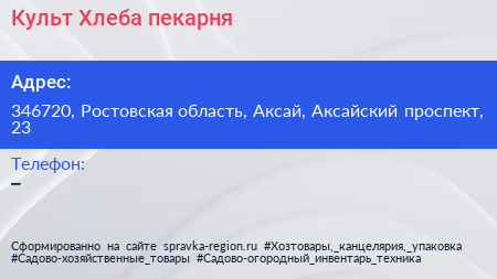 Культ Хлеба, пекарня по адресу 346720, Ростовская область, Аксай, Аксайский проспект, 23 в дальнейшем Организация, размещена в следующих категориях:
