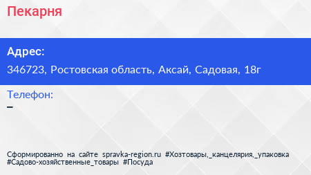 Пекарня по адресу 346723, Ростовская область, Аксай, Садовая, 18г в дальнейшем Организация, размещена в следующих категориях:
