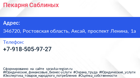Пекарня Саблиных по адресу 346720, Ростовская область, Аксай, проспект Ленина, 1а в дальнейшем Организация, размещена в следующих категориях: