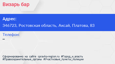 Визарь, бар по адресу 346723, Ростовская область, Аксай, Платова, 83 в дальнейшем Организация, размещена в следующих категориях: