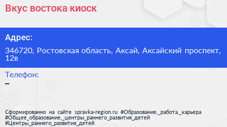 Вкус востока, киоск по адресу 346720, Ростовская область, Аксай, Аксайский проспект, 12в в дальнейшем Организация, размещена в следующих категориях: