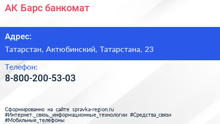 АК Барс, банкомат по адресу Татарстан, Актюбинский, Татарстана, 23 в дальнейшем Организация, размещена в следующих категориях: