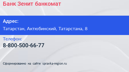 Банк Зенит, банкомат по адресу Татарстан, Актюбинский, Татарстана, 8 в дальнейшем Организация, размещена в следующих категориях:
