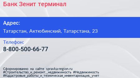 Банк Зенит, терминал по адресу Татарстан, Актюбинский, Татарстана, 23 в дальнейшем Организация, размещена в следующих категориях: