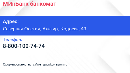 МИнБанк, банкомат по адресу Северная Осетия, Алагир, Кодоева, 43 в дальнейшем Организация, размещена в следующих категориях: