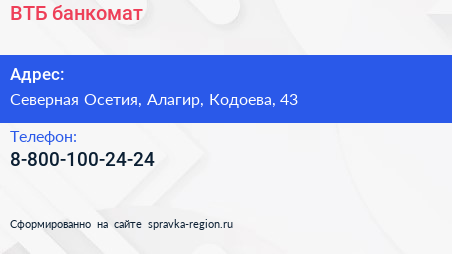 ВТБ, банкомат по адресу Северная Осетия, Алагир, Кодоева, 43 в дальнейшем Организация, размещена в следующих категориях: