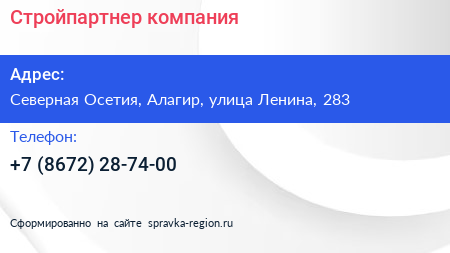 Стройпартнер, компания по адресу Северная Осетия, Алагир, улица Ленина, 283 в дальнейшем Организация, размещена в следующих категориях: