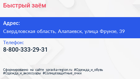 Быстрый заём по адресу Свердловская область, Алапаевск, улица Фрунзе, 39 в дальнейшем Организация, размещена в следующих категориях: