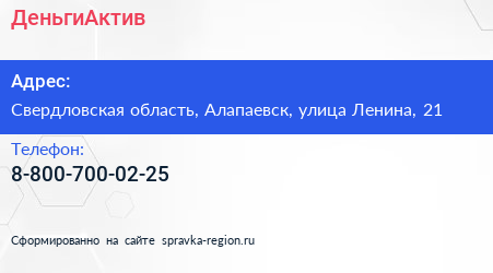 ДеньгиАктив по адресу Свердловская область, Алапаевск, улица Ленина, 21 в дальнейшем Организация, размещена в следующих категориях: