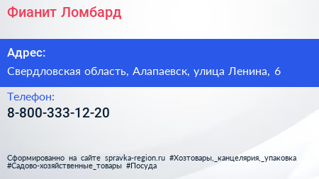 Фианит-Ломбард по адресу Свердловская область, Алапаевск, улица Ленина, 6 в дальнейшем Организация, размещена в следующих категориях: