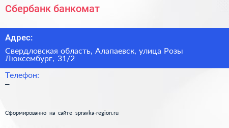 Сбербанк, банкомат по адресу Свердловская область, Алапаевск, улица Розы Люксембург, 31/2 в дальнейшем Организация, размещена в следующих категориях: