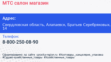 МТС, салон-магазин по адресу Свердловская область, Алапаевск, Братьев Серебряковых, 14 в дальнейшем Организация, размещена в следующих категориях: