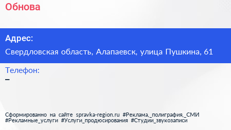 Обнова по адресу Свердловская область, Алапаевск, улица Пушкина, 61 в дальнейшем Организация, размещена в следующих категориях: