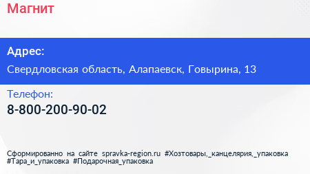 Магнит по адресу Свердловская область, Алапаевск, Говырина, 13 в дальнейшем Организация, размещена в следующих категориях: