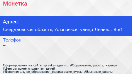 Монетка по адресу Свердловская область, Алапаевск, улица Ленина, 8 к1 в дальнейшем Организация, размещена в следующих категориях: