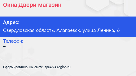 Окна & Двери, магазин по адресу Свердловская область, Алапаевск, улица Ленина, 6 в дальнейшем Организация, размещена в следующих категориях:
