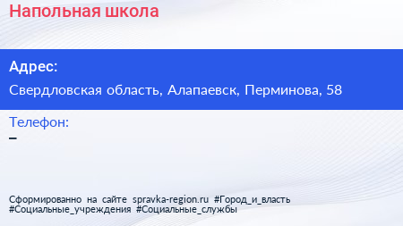 Напольная школа по адресу Свердловская область, Алапаевск, Перминова, 58 в дальнейшем Организация, размещена в следующих категориях: