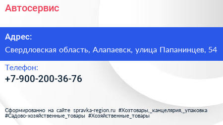Автосервис по адресу Свердловская область, Алапаевск, улица Папанинцев, 54 в дальнейшем Организация, размещена в следующих категориях: