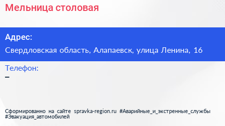 Мельница, столовая по адресу Свердловская область, Алапаевск, улица Ленина, 16 в дальнейшем Организация, размещена в следующих категориях: