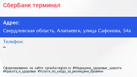 СберБанк, терминал по адресу Свердловская область, Алапаевск, улица Сафонова, 54а в дальнейшем Организация, размещена в следующих категориях: