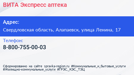 ВИТА Экспресс, аптека по адресу Свердловская область, Алапаевск, улица Ленина, 17 в дальнейшем Организация, размещена в следующих категориях: