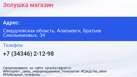 Золушка, магазин по адресу Свердловская область, Алапаевск, Братьев Смольниковых, 34 в дальнейшем Организация, размещена в следующих категориях: