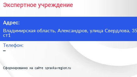 Экспертное учреждение по адресу Владимирская область, Александров, улица Свердлова, 35 ст1 в дальнейшем Организация, размещена в следующих категориях: