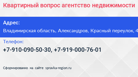 Квартирный вопрос, агентство недвижимости по адресу Владимирская область, Александров, Красный переулок, 4 в дальнейшем Организация, размещена в следующих категориях:
