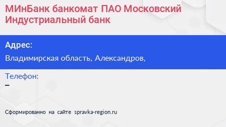 МИнБанк, банкомат, ПАО Московский Индустриальный банк по адресу Владимирская область, Александров, в дальнейшем Организация, размещена в следующих категориях: