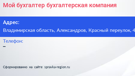 Мой бухгалтер, бухгалтерская компания по адресу Владимирская область, Александров, Красный переулок, 4 в дальнейшем Организация, размещена в следующих категориях: