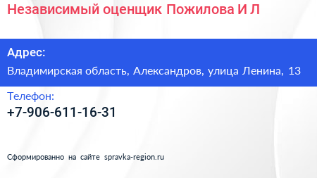 Независимый оценщик Пожилова И.Л. по адресу Владимирская область, Александров, улица Ленина, 13 в дальнейшем Организация, размещена в следующих категориях: