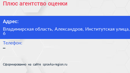 Плюс, агентство оценки по адресу Владимирская область, Александров, Институтская улица, 6 в дальнейшем Организация, размещена в следующих категориях:
