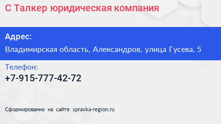 С. Талкер, юридическая компания по адресу Владимирская область, Александров, улица Гусева, 5 в дальнейшем Организация, размещена в следующих категориях:
