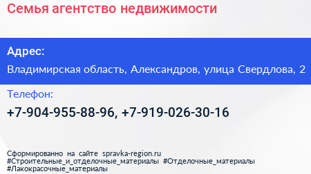Семья, агентство недвижимости по адресу Владимирская область, Александров, улица Свердлова, 2 в дальнейшем Организация, размещена в следующих категориях: