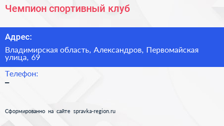 Чемпион, спортивный клуб по адресу Владимирская область, Александров, Первомайская улица, 69 в дальнейшем Организация, размещена в следующих категориях: