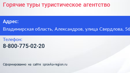 Горячие туры, туристическое агентство по адресу Владимирская область, Александров, улица Свердлова, 56 в дальнейшем Организация, размещена в следующих категориях: