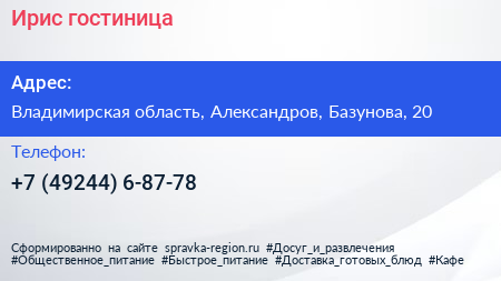 Ирис, гостиница по адресу Владимирская область, Александров, Базунова, 20 в дальнейшем Организация, размещена в следующих категориях: