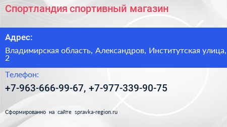 Спортландия, спортивный магазин по адресу Владимирская область, Александров, Институтская улица, 2 в дальнейшем Организация, размещена в следующих категориях: